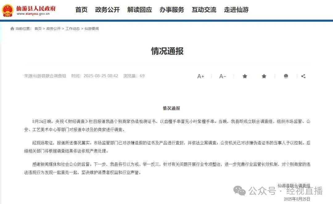 8月24日晚,央视《财经查询拜访》栏目报道我县个体商家伪制检测证书,以血檀手串假充小叶紫檀手串。当晚,我县即成立结合查询拜访组,组织市场监管、、工艺美术核心等部分对报道中涉及的商家进行查询拜访。